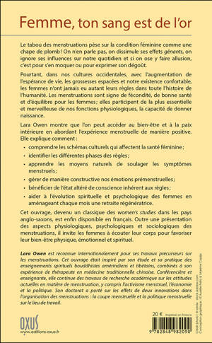 Le tabou des menstruations pèse sur la condition féminine comme une chape de plomb ! On n’en parle pas, on dissimule ses effets gênants, on ignore ses influences sur notre quotidien et si on ose y faire allusion, c’est pour s’en moquer ou pour exprimer son dégoût. Pourtant, dans nos cultures occidentales, avec l’augmentation de l’espérance de vie, les grossesses espacées et notre existence confortable, les femmes n’ont jamais eu autant leurs règles dans toute l’histoire de l’humanité. Les menstruations sont signe de fécondité, de bonne santé, et d’équilibre pour les femmes ; elles participent de la plus essentielle et merveilleuse de nos fonctions physiologiques, la capacité de donner naissance. Lara Owen montre que l’on peut accéder au bien-être et à la paix intérieure en abordant l’expérience menstruelle de manière positive. Outre une présentation des aspects physiologiques, psychologiques et sociologiques des menstruations, cet ouvrage invite les femmes à écouter leur corps pour favoriser leur bien-être physique, émotionnel et spirituel.