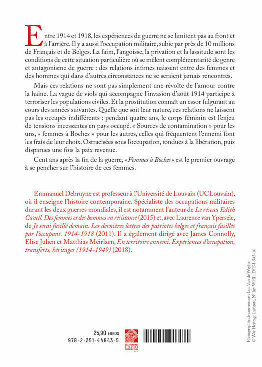 Entre 1914 et 1918, les experiences de guerre ne se limitent pas au front et a l'arriere. Il y a aussi l'occupation militaire, subie par pres de 10 millions de Francais et de Belges. La faim, l'angoisse, la privation et la lassitude sont les conditions de cette situation particuliere ou se melent complementarite de genre et antagonisme de guerre: des relations intimes naissent entre des femmes et des hommes qui dans d'autres circonstances ne se seraient jamais rencontres. Mais ces relations ne sont pas simplement une revolte de l'amour contre la haine. La vague de viols qui accompagne l'invasion d'aout 1914 participe a terroriser les populations civiles. Et la prostitution connait un essor fulgurant au cours des annees suivantes. Quelle que soit leur nature, ces relations ne laissent pas les occupes indifferents: pendant quatre ans, le corps feminin est l'enjeu de tensions incessantes en pays occupe. Sources de contamination pour les uns, femmes a Boches pour les autres, celles qui frequentent l'ennemi font les frais de leur choix. Ostracisees sous l'occupation, tondues a la liberation, puis disparues une fois la paix revenue. Cent ans apres la fin de la guerre, Femmes a Boches est le premier ouvrage a se pencher sur l'histoire de ces femmes.