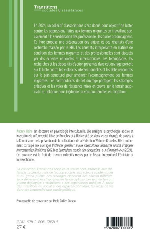 En 2024, un collectif d'associations s'est donné pour objectif de lutter contre les oppressions faites aux femmes migrantes en travaillant spécialement à la sensibilisation des professionnel-les qui les accompagnent. Ce livre propose une présentation des enjeux et des résultats d'une recherche réalisée par le RIFI. Les constats interpellants en matière de condition des femmes migrantes et des professionnelles sont discutés par des expertes nationales et internationales. Les témoignages, les recherches et les dispositifs d'action présentés dans cet ouvrage portent sur la lutte contre les violences intersectionnelles et les défis rencontrés sur le plan structurel pour améliorer l'accompagnement des femmes migrantes. Les contributrices de cet ouvrage partagent les stratégies créatives et les voies de résistance mises en oeuvre sur le terrain associatif et politique pour (re)donner la voix aux femmes en migration.