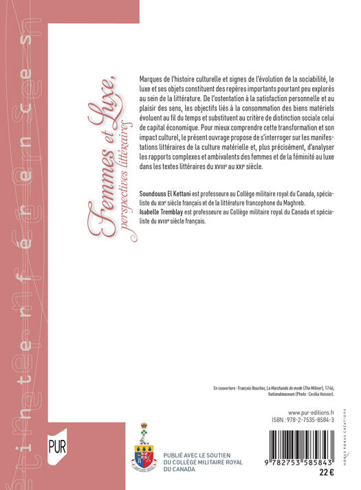 Marques de l'histoire culturelle et signes de l'évolution de la sociabilité, le luxe et ses objets constituent des repères importants pourtant peu explorés au sein de la littérature. De l'ostentation à la satisfaction personnelle et au plaisir des sens, les objectifs liés à la consommation des biens matériels évoluent au fil du temps et substituent au critère de distinction sociale celui de capital économique. Pour mieux comprendre cette transformation et son impact culturel, le présent ouvrage propose de s'interroger sur les manifestations littéraires de la culture matérielle et, plus précisément, d'analyser les rapports complexes et ambivalents des femmes et de la féminité au luxe dans les textes littéraires du XVIIIe au XXIe siècle.