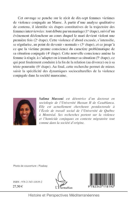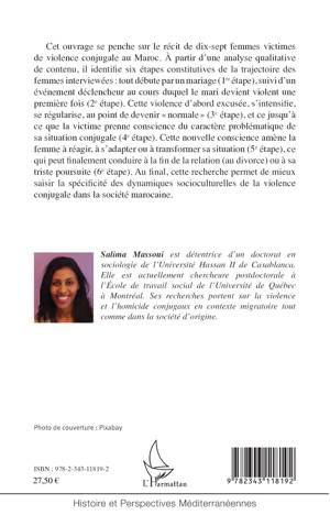 Une étude nationale menée au Maroc en 2009-2010 a permis de constater que 62,8 % des femmes de 18 à 64 ans ont été victimes d'une forme de violence durant les 12 mois précédant l'enquête. Cette recherche veut contribuer à l'avancement des connaissances en permettant de saisir les rapports de domination entre les sexes et plus particulièrement la violence exercée contre les femmes dans le couple marocain. Quels sont les processus et les justifications de la violence conjugale au Maroc selon le discours des femmes victimes ? Pour répondre à cette question, l'auteure s'appuie sur le récit de 17 femmes, recueilli dans 3 centres d'écoute de la région de Rabat.