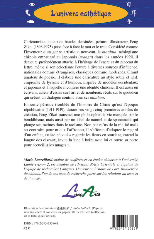 Caricaturiste, auteur de bandes dessinées, peintre, illustrateur, Feng Zikai (1898-1975) est considéré comme l'inventeur d'un genre artistique nouveau, le manhua, néologisme chinois emprunté au japonais (manga) dans les années 1920. Il demeure profondément attaché à l'héritage de l'encre et du pinceau du lettré. Grand amateur de poésie, il élabore une caricature au style sobre et naïf, empreinte de lyrisme et d'humour, inspirée de modèles occidentaux et japonais et à laquelle il confère une identité chinoise.