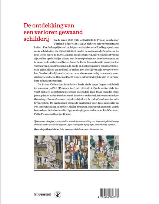 In de jaren 1909-1914 ontwikkelt de Franse kunstenaar Fernand Léger (1881-1955) zich tot een vooraanstaand kubist. Een belangrijke rol in Légers artistieke ontwikkeling speelt een reeks schilderijen die hij in 1911-1912 maakt, de zogenaamde Fumées sur les toits (Rook boven de daken). In deze reeks schildert Léger het uitzicht vanuit zijn atelier op de Parijse daken, met de rookpluimen uit de schoorstenen en in de verte de kathedraal Notre-Dame de Paris. De combinatie van de zachte vormen van de rookwolken en de harde en hoekige massa’s van de architectuur grijpt hij aan om radicaal te breken met de stijl van zijn vroegere werken. Van betrekkelijk realistisch en monochroom werkt hij naar steeds meer abstractie en kleur. Deze zoektocht resulteert uiteindelijk in zijn zo herkenbare kubistische werken. De Triton Collection Foundation bezit sinds 1999 Légers schilderij Le quatorze juillet (Veertien juli) uit 1912-1913. Op de achterzijde bevindt zich een voorstelling die zwaar beschadigd leek. Maar toen die enige jaren geleden nader bekeken werd, brachten onderzoek en restauratie door Gwendolyn Boevé-Jones een onbekend doek uit de reeks Fumées sur les toits tevoorschijn. De ontdekking vormt de aanleiding voor deze publicatie en een tentoonstelling in Kröller-Müller Museum, waarin ook aandacht wordt besteed aan de invloeden die Léger onderging van onder meer Paul Cézanne, Pablo Picasso en Georges Braque.