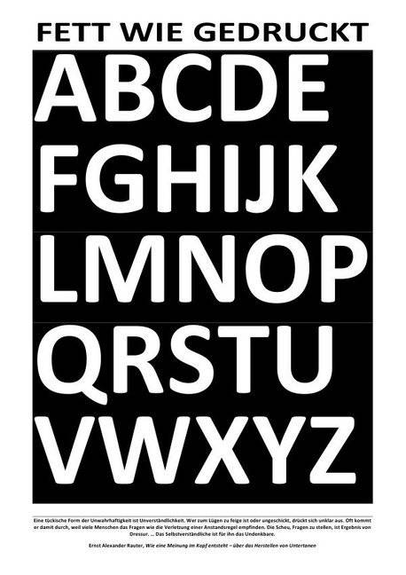 ARBEIT, BILDUNG, CODE, DEMOKRATIE, EXPORT, FINANZ, GELD, HAUSHALT, INTERNATIONAL, JURA, KONSENS,LEGAL, MATERIALISMUS, NORMAL, OPPOSITION, POLITIK, QUELLE, RATING, STEUER, TERROR, UNTEN, VERFASSUNG, WAHL, X/Y, Y/X, ZUKUNFT: "Eine tückische Form der Unwahrhaftigkeit ist Unverständlichkeit. Wer zum Lügen zu feige ist oder ungeschickt, drückt sich unklar aus. Oft kommt er damit durch, weil viele Menschen das Fragen wie die Verletzung einer Anstandsregel empfinden. Die Scheu, Fragen zu stellen, ist Ergebnis von Dressur. ... Das Selbstverständliche ist für ihn das Undenkbare." (Zitat: Ernst Alexander Rauter, Wie eine Meinung im Kopf entsteht - über das Herstellen von Untertanen)