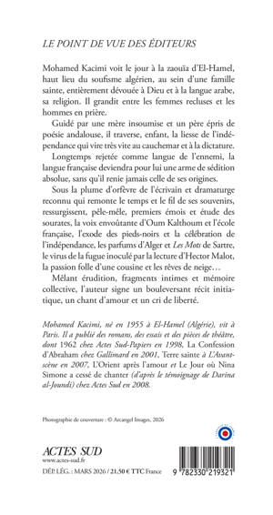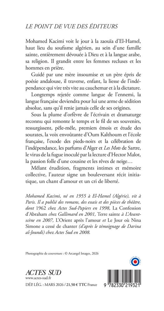 Mohamed Kacimi voit le jour à la zaouïa d'El-Hamel, haut lieu du soufisme algérien, au sein d'une famille sainte, entièrement dévouée à Dieu et à la langue arabe, sa religion. Il grandit entre les femmes recluses et les hommes en prière. Guidé par une mère insoumise et un père épris de poésie andalouse, il traverse, enfant, la liesse de l'indépendance qui vire très vite au cauchemar et à la dictature. Longtemps rejetée comme langue de l'ennemi, la langue française deviendra pour lui une arme de sédition absolue, sans qu'il renie jamais celle de ses origines. Sous la plume d'orfèvre de l'écrivain et dramaturge reconnu qui remonte le temps et le fil de ses souvenirs, ressurgissent, pêle-mêle, premiers émois et étude des sourates, la voix envoûtante d'Oum Kalthoum et l'école française, l'exode des pieds-noirs et la célébration de l'indépendance, les parfums d'Alger et "Les Mots" de Sartre, le virus de la fugue inoculé par la lecture d'Hector Malot, la passion folle d'une cousine et les rêves de neige... Mêlant érudition, fragments intimes et mémoire collective, l'auteur signe un bouleversant récit initiatique, un chant d'amour et un cri de liberté.