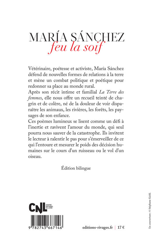 Vétérinaire de campagne, poétesse et activiste, María Sánchez défend de nouvelles formes de relations à la terre et poursuit depuis plusieurs années un combat politique et poétique pour rendre sa place au monde rural. Cinq après son récit intime et familial "La Terre des femmes", elle nous offre un recueil teinté de tristesse et de colère, surgi de la douleur de voir disparaître les animaux, les rivières, les forêts, les paysages de son enfance. Ces poèmes envoûtants, lumineux et toujours politiques - proposés en version bilingue - se lisent comme un hymne à la nature et un défi à l'inertie qui nous piège, dans l'espoir d'aller vers un avenir plus vivable et désirable.
