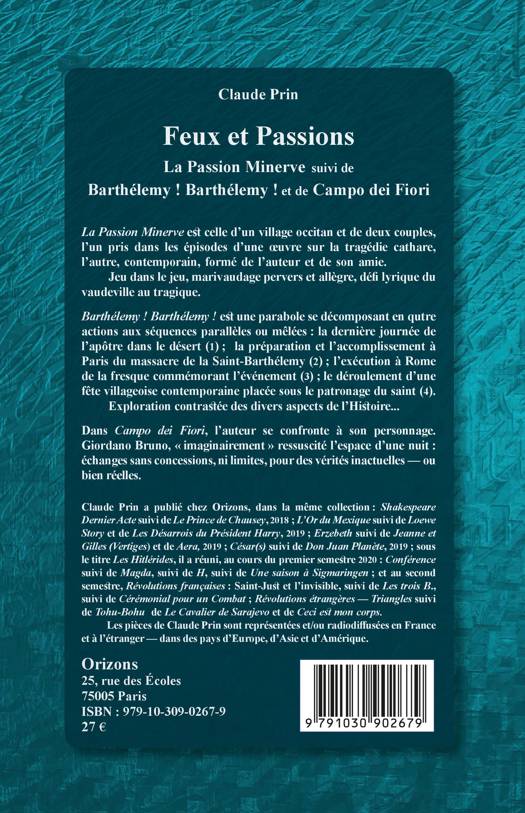 La Passion Minerve est celle d'un village occitan et de deux couples, l'un pris dans les épisodes d'une œuvre sur la tragédie cathare, l'autre, contemporain, formé de l'auteur et de son amie. Barthélemy ! Barthélemy ! est une parabole se décomposant en quatre actions aux séquences parallèles ou mêlées : notamment la préparation et l'accomplissement à Paris du massacre de la Saint-Barthélemy. Dans Campo dei Fiori, l'auteur se confronte à son personnage. Giordano Bruno, « imaginairement » ressuscité l'espace d'une nuit : échanges sans concessions, ni limites, pour des vérités inactuelles — ou bien réelles.