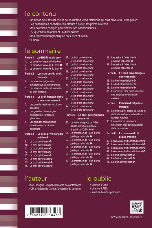 • 45 fiches pour réviser tout le cours d'introduction historique au droit privé et au droit public : les définitions à connaître, les erreurs à éviter, les points à retenir