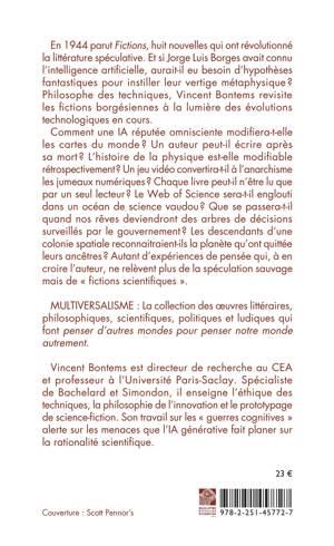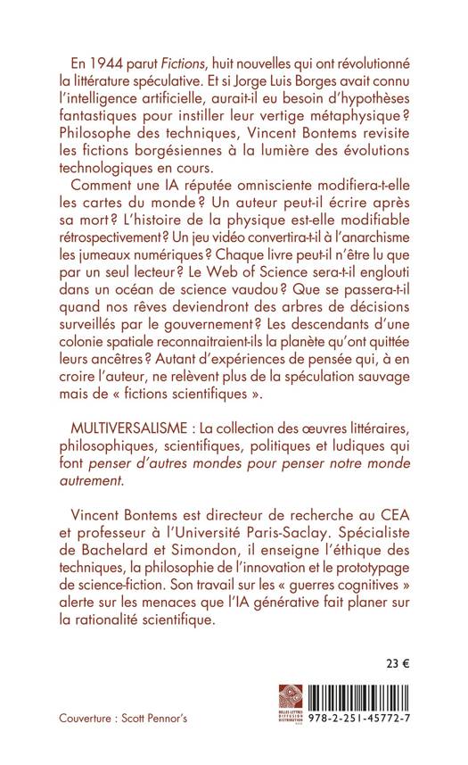 En 1944 parut Fictions, huit nouvelles qui ont révolutionné la littérature spéculative. Et si Jorge Luis Borges avait connu l’intelligence artificielle, aurait-il eu besoin d’hypothèses fantastiques pour instiller leur vertige métaphysique. Philosophe des techniques, Vincent Bontems revisite les fictions borgésiennes à la lumière des évolutions technologiques en cours. Comment une IA réputée omnisciente modifiera-t-elle les cartes du monde ? Un auteur peut-il écrire après sa mort ? L’histoire de la physique est-elle modifiable rétrospectivement ? Un jeu vidéo convertira-t-il à l’anarchisme les jumeaux numériques ? Chaque livre peut-il n’être lu que par un seul lecteur ? Le Web of Science sera-t-il englouti dans un océan de science vaudou ? Que se passera-t-il quand nos rêves deviendront des arbres de décisions surveillés par le gouvernement ? Les descendants d’une colonie spatiale reconnaitraient-ils la planète qu’ont quittée leurs ancêtres ? Autant d’expériences de pensée qui, à en croire l’auteur, ne relèvent plus de la spéculation sauvage mais de « fictions scientifiques ».
