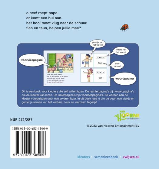 Vrolijk verhaal over Fien & Teun voor kleuters die zelf al willen lezen. De linkerpagina’s zijn voorleespagina’s voor een ervaren lezer. De rechterpagina’s zijn woordpagina’s die de kleuter zelf kan lezen. Zo lees je om de beurt een stukje en geniet je samen van het verhaal.