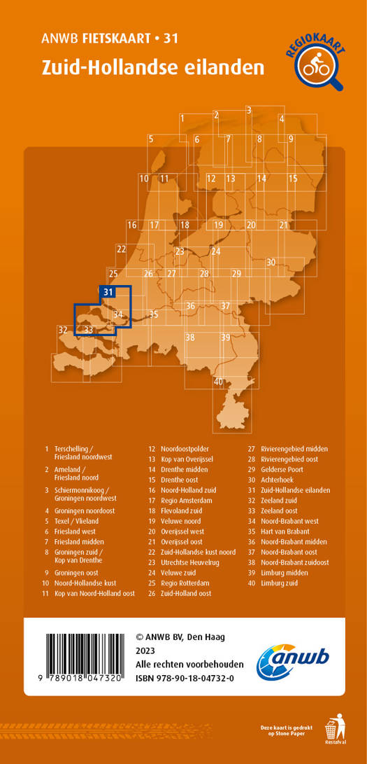 De populaire serie ANWB Fietskaarten is vernieuwd. Deze opvouwbare fietskaarten zijn ideaal voor wie meer wil dan alleen op knooppunten fietsen. Op de papieren routekaart staan veel details: fietspaden, fietsknooppunten, horeca, musea, campings, pontjes, LF-routes (Landelijke Fietsroutes), fietsverhuur en toeristische informatie. De kaart fungeert als handige routeplanner en heeft een schaal van 1:66.666. In totaal zijn er 40 ANWB Fietskaarten, van de Wadden tot Maastricht en van Den Haag tot de Achterhoek. Plan je fietsroute door Nederland voortaan met overzichtelijke ANWB Fietskaarten!
