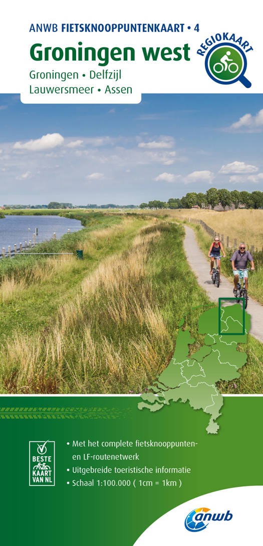 Stippel je eigen fietsroute door Groningen west uit met de ANWB fietsknooppuntenkaart. Geniet van het Nederlandse landschap en plan een route door onze Nationale Parken, fiets langs water en over dijken, door polders en weidelandschappen en pauzeer onderweg op een gezellig terras. Met de vernieuwde knooppuntenkaart kies je je eigen fietsroute. De kaart bevat alle LF-routes (Landelijke Fietsroutes), toeristische informatie, musea, horeca en een duidelijke legenda. In totaal zijn er 28 ANWB Fietsknooppuntenkaarten.