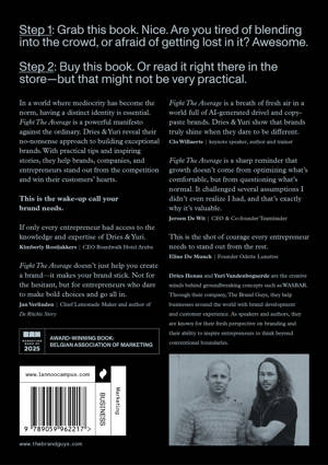 Step 1: Grab this book. Nice. Are you tired of blending into the crowd, or afraid of getting lost in it? Awesome. Step 2: Buy this book. Or read it right there in the store—but that might not be very practical. In a world where mediocrity has become the norm, having a distinct identity is essential. Fight The Average is a powerful manifesto against the ordinary. Dries &Yuri reveal their no-nonsense approach to building exceptional brands.With practical tips and inspiring stories, they help brands, companies, and entrepreneurs stand out from the competition and win their customers' hearts. This is the wake-up call your brand needs.