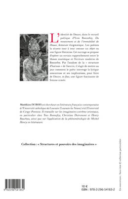 L'identité de Douve, dans le recueil poétique d'Yves Bonnefoy, Du mouvement et de l'immobilité de Douve demeure énigmatique. Les poèmes la situent tour à tour comme un objet ou une figure féminine. Cet ouvrage se propose d'opérer un certain rapprochement entre le blason marotique et l'écriture moderne de Bonnefoy. Par l'analyse de la "structure d'horizon" de l'oeuvre, il s'agit de mettre au jour comment le poète interroge la lyrique amoureuse et ses implications, pour faire de Douve, une figure fascinante de femme aimée.