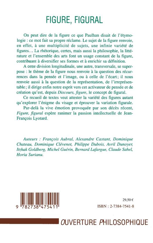 On peut dire de la figure ce que Paulhan disait de l'étymologie : ce mot fait sa propre réclame. Le sujet de la figure renvoie en effet, à une multiplicité de sujets, une infinie variété de figures Ce recueil de textes veut attester la variété des figures autant qu'explorer l'énigme du visage et éprouver la variation figurale.