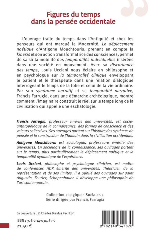 L'ouvrage traite du temps dans l'Antiquité et chez les penseurs qui ont marqué la Modernité. Le déplacement noétique d'Antigone Mouchtouris, prenant en compte la kinesis et son action transformatrice des consciences, permet de saisir la mobilité des temporalités individuelles insérées dans une société en mouvement. Avec sa discordance des temps, Louis Ucciani nous éclaire en philosophe et en psychologue sur la temporalité clinique enveloppant le patient et le thérapeute dans une relation dialogique interrogeant le temps de la folie et celui de la vie ordinaire. Par son syndrome narratif et sa temporalité narrative, Francis Farrugia, dans une démarche archéologique, montre comment l'imaginaire construit le réel sur le temps long de la civilisation qui appelle une eschatologie.
