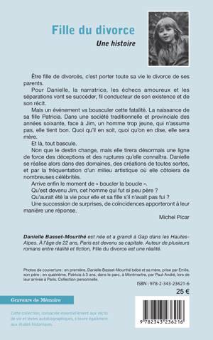 Être fille de divorcés, c'est porter toute sa vie le divorce de ses parents. Pour Danielle, la narratrice, les échecs amoureux et les séparations vont se succéder, fil conducteur de son existence et de son récit. Mais un événement va bousculer cette fatalité. La naissance de sa fille Patricia. Dans une société traditionnelle et provinciale des années soixante, face à Jim, un homme trop jeune, qui n'assume pas, elle tient bon. Quoi qu'il en soit, quoi qu'on en dise, elle sera mère. Et là, tout bascule. Non que le destin change, mais elle tirera désormais une ligne de force des déceptions et des ruptures qu'elle connaîtra. Danielle se réalise alors dans des domaines, des créations de toutes sortes, et par la fréquentation d'un milieu artistique où elle côtoiera de nombreuses célébrités.Arrive enfin le moment de boucler la boucle . Qu'est devenu Jim, cet homme qui fut si peu père ? Qu'aurait été la vie pour elle et sa fille s'il n'avait pas fui ? Une succession de surprises, de coïncidences apporteront à leur manière une réponse. Michel Picar