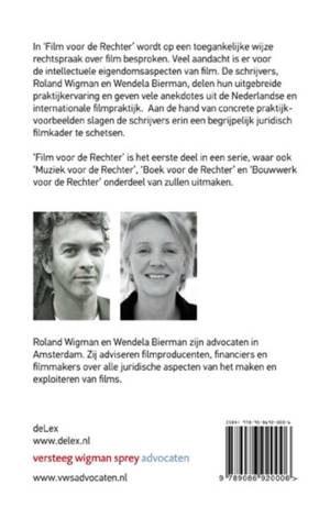 In Film voor de Rechter wordt op een toegankelijke wijze rechtspraak over film besproken. Veel aandacht is er voor de intellectuele eigendomsaspecten van film. De schrijvers, Roland Wigman en Wendela Bierman, delen hun uitgebreide praktijkervaring en geven vele anekdotes uit de Nederlandse en internationale filmpraktijk. Aan de hand van concrete praktijkvoorbeelden slagen de schrijvers erin een begrijpelijk juridisch filmkader te schetsen. Film voor de Rechter is het eerste deel in een serie, waar ook Muziek voor de Rechter, Boek voor de Rechter en Bouwwerk voor de Rechter onderdeel van zullen uitmaken. Roland Wigman en Wendela Bierman zijn advocaten in Amsterdam. Zij adviseren filmproducenten, financiers en filmmakers over alle juridische aspecten van het maken en exploiteren van films.