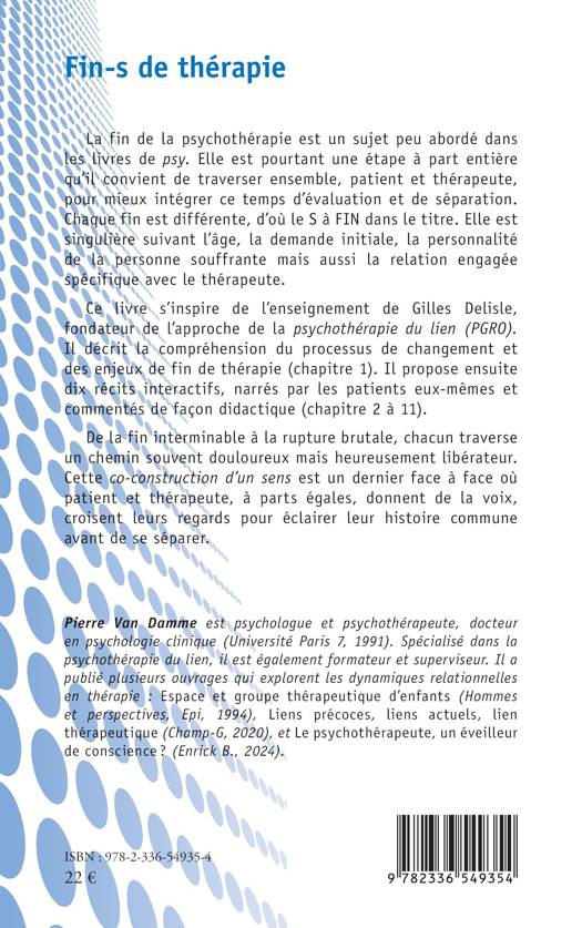 La fin de la psychothérapie est un sujet peu abordé dans les livres de psy. Elle est pourtant une étape à part entière qu'il convient de traverser ensemble, patient et thérapeute, pour mieux intégrer ce temps d'évaluation et de séparation. Chaque fin est différente, d'où le S à FIN dans le titre. Elle est singulière suivant l'âge, la demande initiale, la personnalité de la personne souffrante mais aussi la relation engagée spécifique avec le thérapeute. Ce livre s'inspire de l'enseignement de Gilles Delisle, fondateur de l'approchedela psychothérapie du lien (PGRO). Il décrit la compréhension du processus de changement et des enjeux de fin de thérapie (chapitre 1). Il propose ensuite dix récits interactifs, narrés par les patients eux-mêmes et commentés de façon didactique (chapitre 2 à 11). De la fin interminable à la rupture brutale, chacun traverse un chemin souvent douloureux mais heureusement libérateur. Cette co-construction d'un sens est un dernier face à face où patient et thérapeute, à parts égales, donnent de la voix, croisent leurs regards pour éclairer leur histoire commune avant de se séparer.