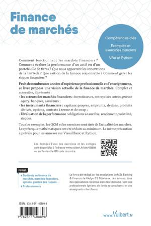 Tous les exemples, les QCM et les exercices sont tirés de l’actualité des marchés. Les prérequis mathématiques ont été réduits au minimum. La même précaution a prévalu pour les annexes sur Visual Basic et Python.