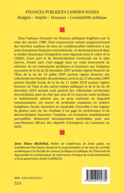 Dans l'optique d'assainir ses finances publiques fragilisées par la crise des année 1980, l'Etat camerounais s'est engagé dans un vaste mouvement de réformes de ses instruments juridiques et financiers. Ce nouveau cadre juridique et institutionnel national est source de profondes mutations en matière budgétaire, fiscale, douanière et comptable. Favorable à une logique de gestion axée sur les résultats, il est gage de performance et de décentralisation financière. Toutefois, ces évolutions manifestement perceptibles demeurent nécessairement perfectibles pour une concrétisation efficace des objectifs d'émergence du Cameroun en 2035.