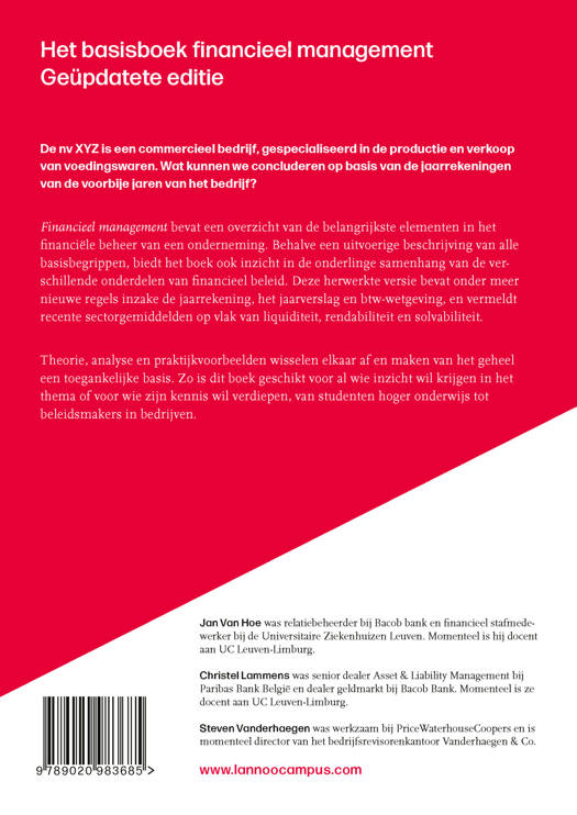 Financieel management bevat een overzicht van de belangrijkste elementen in het financiële beheer van een onderneming. Behalve een uitvoerige beschrijving van alle basisbegrippen, biedt het boek ook inzicht in de onderlinge samenhang van de verschillende onderdelen van financieel beleid. Deze herwerkte versie bevat onder meer nieuwe regels inzake de jaarrekening, het jaarverslag en btw-wetgeving, en vermeldt recente sectorgemiddelden op vlak van liquiditeit, rendabiliteit en solvabiliteit.