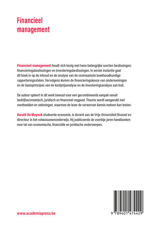 Financieel management houdt zich bezig met twee belangrijke soorten beslissingen: financieringsbeslissingen en investeringsbeslissingen. In eerste instantie gaat dit boek in op de inhoud en de analyse van de voornaamste boekhoudkundige rapporteringsstaten. Vervolgens komen de financieringskeuze van ondernemingen en de basisprincipes van de kostprijsanalyse en de investeringsanalyse aan bod.