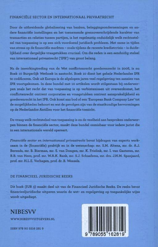 Financiële sector en internationaal privaatrecht bevat bijdragen van experts werkzaam in de (financiële) praktijk en in de wetenschap: mr. S.M. Altena, mr. dr. A.J. Berends, mr. B. Bierman, mr. S. van Dongen, mr. K. Frielink, mr. I. van Gasteren, mr. R.B. van Hees, prof. mr. W.A.K. Rank, mr. S.J. Schaafsma, mr. drs. J.H.M. Spanjaard, prof. mr. H.L.E. Verhagen, prof. dr. B. Wessels.