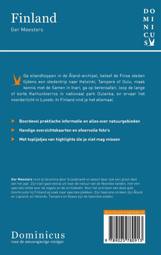 Ontdek Finland op vakantie met deze Dominicus-reisgids en verken Helsinki, Rovaniemi, Turku, prachtige meren en meer. Bezoek hoofdstad Helsinki en verwonder je in de Domkerk, maak kennis met de architectuur van Alvar Aalto, het design van Marimekko en de muziek van Jean Sibelius. Trek de ongerepte natuur in en geniet in zowel de zomer als winter van sprookjesachtige landschappen, betoverende meren en de prachtige kustlijn. In de koude maanden laat je je betoveren door de witte wonderwereld en de pracht van het noorderlicht. Deze reisgids staat boordevol praktische informatie, natuurgebieden, historische achtergronden, handige overzichtskaarten, sfeervolle foto's en uitgebreide culturele achtergrondinformatie, is altijd up-to-date en geschreven door een Nederlandstalige expert.