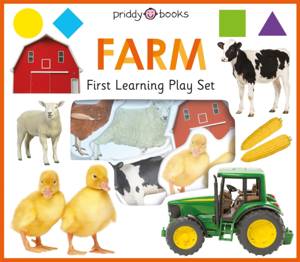 The First Learning Farm Play Set includes a board book, featuring bright photographs of farm animals and vehicles, and 12 chunky pieces neatly packed in a plastic pocket.