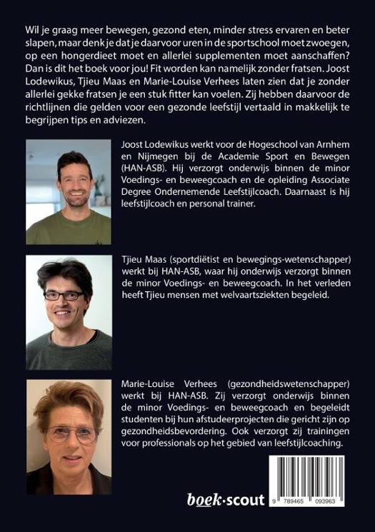 Wil je graag meer bewegen, gezond eten, minder stress ervaren en beter slapen, maar denk je dat je daarvoor uren in de sportschool moet zwoegen, op een hongerdieet moet en allerlei supplementen moet aanschaffen? Dan is dit het boek voor jou! Fit worden kan namelijk zonder fratsen. Joost Lodewikus, Tjieu Maas en Marie-Louise Verhees laten zien dat je zonder allerlei gekke fratsen je een stuk fitter kan voelen. Zij hebben daarvoor de richtlijnen die gelden voor een gezonde leefstijl vertaald in makkelijk te begrijpen tips en adviezen.