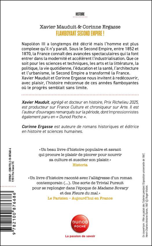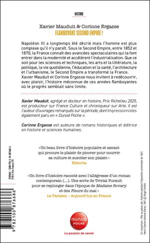 Napoléon III a longtemps été décrié mais l’homme est plus complexe qu’il n’y paraît. Sous le Second Empire, entre 1852 et 1870, la France connaît des avancées spectaculaires qui la font entrer dans la modernité et accélèrent l'industrialisation. Que ce soit pour les sciences et techniques, les arts et la littérature, la politique, la vie quotidienne, l’éducation et la santé, l’architecture et l’urbanisme, le Second Empire a transformé la France. Xavier Mauduit et Corinne Ergasse nous invitent à redécouvrir, avec plaisir, l’histoire méconnue de ces années flamboyantes où le progrès semblait sans limite.