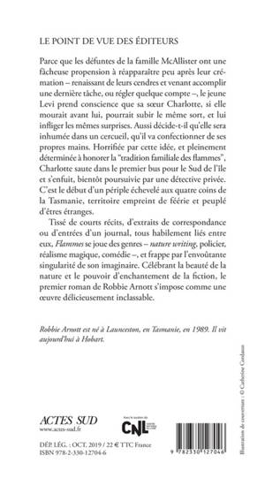 Tissé de courts récits, d'extraits de correspondance ou d'entrées d'un journal, tous habilement liés entre eux, «Flammes» se joue des genres - «nature writing», policier, réalisme magique, comédie -, et frappe par l'envoûtante singularité de son imaginaire. Célébrant la beauté de la nature et le pouvoir d'enchantement de la fiction, le premier roman de Robbie Arnott s'impose comme une oeuvre délicieusement inclassable.