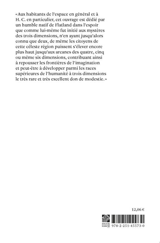 Aux habitants de l'espace en general et a H. C. en particulier, cet ouvrage est dedie par un humble natif de Flatland dans l'espoir que comme lui-meme fut initie aux mysteres des trois dimensions, n'en ayant jusqu'alors connu que deux, de meme les citoyens de cette celeste region puissent s'elever encore plus haut jusqu'aux arcanes des quatre, cinq ou meme six dimensions, contribuant ainsi a repousser les frontieres de l'imagination et peut-etre a developper parmi les races superieures de l'humanite a trois dimensions le tres rare et tres excellent don de modestie.