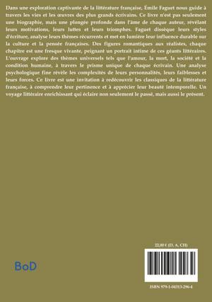Dans une exploration captivante de la littérature française, Émile Faguet nous guide à travers les vies et les oeuvres des plus grands écrivains. Ce livre n'est pas seulement une biographie, mais une plongée profonde dans l'âme de chaque auteur, révélant leurs motivations, leurs luttes et leurs triomphes. Faguet dissèque leurs styles d'écriture, analyse leurs thèmes récurrents et met en lumière leur influence durable sur la culture et la pensée françaises. Des figures romantiques aux réalistes, chaque chapitre est une fresque vivante, peignant un portrait intime de ces géants littéraires. L'ouvrage explore des thèmes universels tels que l'amour, la mort, la société et la condition humaine, à travers le prisme unique de chaque écrivain. Une analyse psychologique fine révèle les complexités de leurs personnalités, leurs faiblesses et leurs forces. Ce livre est une invitation à redécouvrir les classiques de la littérature française, à comprendre leur pertinence et à apprécier leur beauté intemporelle. Un voyage littéraire enrichissant qui éclaire non seulement le passé, mais aussi le présent.