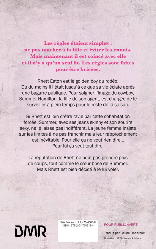 Rhett Eaton est le golden boy du rodéo. Du moins, il l’était jusqu’à ce qu’une bagarre publique ne vienne ternir son image. Sous pression de ses sponsors, il accepte d’être supervisé pendant toute la saison par la fille de son agent, Summer Hamilton, une jeune avocate fraîchement diplômée.