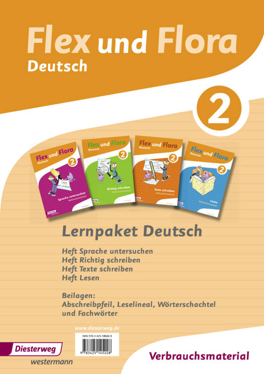 Das Flex und Flora 2-Paket enthält die Hefte Sprache untersuchen 2, Richtig schreiben 2, Texte schreiben 2, Lesen 2 sowie einige Beilagen: einen Abschreibpfeil, ein Leselineal, eine Wörterschachtel und eine Fachwörterliste.