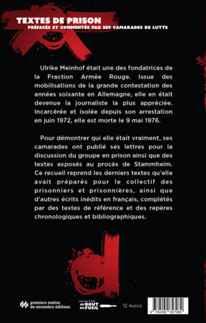 Ulrike Meinhof était une des fondatrices de la Fraction Armée Rouge. Issue des mobilisations de la grande contestation des années soixante en Allemagne, elle en était devenue la journaliste la plus appréciée. Incarcérée et isolée depuis son arrestation en juin 1972, elle est morte le 9 mai 1976. Pour démontrer qui elle était vraiment, ses camarades ont publié ses lettres pour la discussion du groupe en prison ainsi que des textes exposés au procès de Stammheim. Ce recueil reprend les derniers textes qu'elle avait préparés pour le collectif des prisonniers et prisonnières, ainsi que d'autres écrits inédits en français, complétés par des textes de référence et des repères chronologiques et bibliographiques.