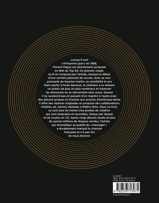 Lorsqu'il sort "N'importe quoi" en 1988, Florent Pagny est directement propulsé en tête du Top 50. Ce premier single, écrit et composé par l'artiste, maque le début d'une carrière jalonnée de succès. Avec sa voix puissante de baryton martin, sa sensibilité et son franc-parler à toute épreuve, le chanteur a su séduire un public de plus en plus nombreux et traverser les décennies en se réinventant sans cesse. Quand il ne surprend pas en passant d'un registre à l'autre avec des albums lyriques et d'autres aux accents d'Amérique latine, il offre des reprises originales ou propose des collaborations inédites, de Johhny Hallyday à Maître Gims. Dans ce livre, ce sont plus de trente-cinq années de création qui sont analysées et racontées, disque par disque et de vinyles en CD. Après vingt albums studio et plus de quinze millions de disques vendus, l'artiste qui revendique sa qualité de "messager" a durablement marqué la chanson française et n'a pas fini de nous étonner.