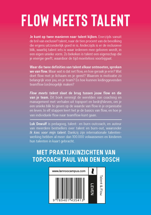 Flow meets talent slaat de brug tussen jouw flow en die van je team. Dit boek verenigt de werelden van coaching en management met verhalen uit topsport en bedrijfsleven, om je een unieke blik te geven op de waarde van flow in je organisatie en leven. In elf stappen leert het je de basics van flow, en hoe je van individuele flow naar teamflow kunt gaan.