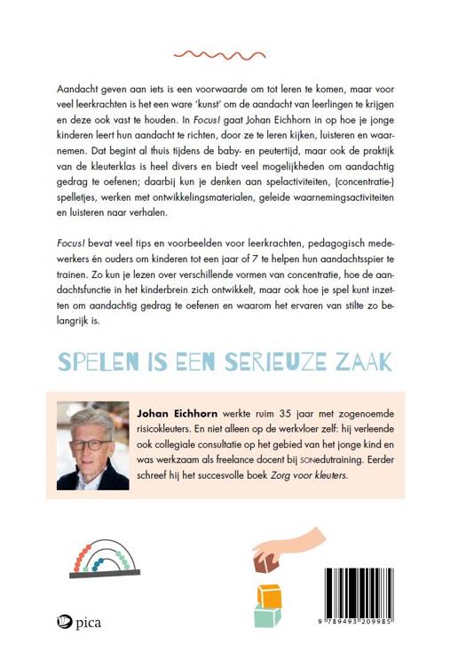 Aandacht geven aan iets is een voorwaarde om tot leren te komen, maar voor veel leerkrachten is het een ware ‘kunst’ om de aandacht van leerlingen te krijgen en deze ook vast te houden. In Focus! gaat Johan Eichhorn in op hoe je jonge kinderen leert hun aandacht te richten, door ze te leren kijken, luisteren en waarnemen. Dat begint al thuis tijdens de baby- en peutertijd, maar ook de praktijk van de kleuterklas is heel divers en biedt veel mogelijkheden om aandachtig gedrag te oefenen; daarbij kun je denken aan spelactiviteiten, (concentratie)spelletjes, werken met ontwikkelingsmaterialen, geleide waarnemingsactiviteiten en luisteren naar verhalen.