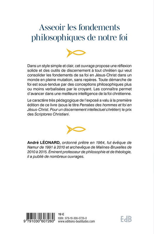 Dans un style simple et clair, cet ouvrage propose une réflexion solide et des outils de discernement à tout chrétien qui veut consolider les fondements de sa foi en Jésus-Christ dans un monde en pleine mutation, sans repères. Toute démarche de foi est sous-tendue par des conceptions philosophiques plus ou moins verbalisées par le croyant. Les connaître permet d’avancer dans une meilleure intelligence de la foi chrétienne. Le caractère très pédagogique de l’exposé a valu à la première édition de ce livre (sous le titre Pensées des hommes et foi en Jésus-Christ. Pour un discernement intellectuel chrétien) le prix des Scriptores Christiani.