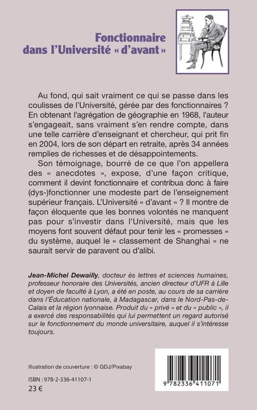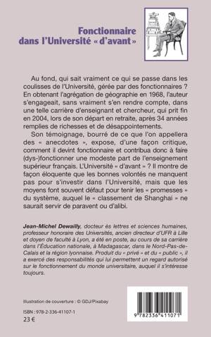 Au fond, qui sait vraiment ce qui se passe dans les coulisses de l'Université, gérée par des fonctionnaires ? En obtenant l'agrégation de géographie en 1968, l'auteur s'engageait, sans vraiment s'en rendre compte, dans une telle carrière d'enseignant et chercheur, qui prit fin en 2004, lors de son départ en retraite, après 34 années remplies de richesses et de désappointements. Son témoignage, bourré de ce que l'on appellera des anecdotes, expose, d'une façon critique, comment il devint fonctionnaire et contribua donc à faire (dys-)fonctionner une modeste part de l'enseignement supérieur français. L'Université d'avant Il montre de façon éloquente que les bonnes volontés ne manquent pas pour s'investir dans l'Université, mais que les moyens font souvent défaut pour tenir les promesses du système, auquel le classement de Shanghai ne saurait servir de paravent ou d'alibi.