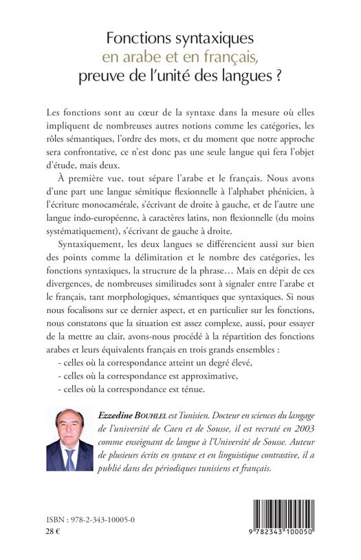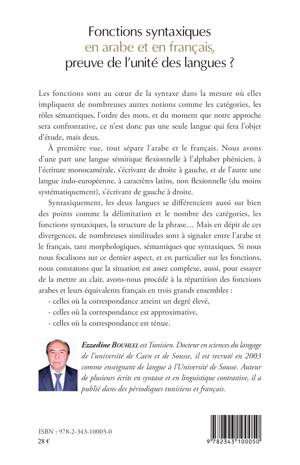 A première vue, tout sépare l'arabe et le français. Nous avons d'une part une langue sémitique flexionnelle à l'alphabet phénicien, à l'écriture monocamérale, s'écrivant de droite à gauche, et de l'autre une langue indo-européenne, à caractères latins, non flexionnelle (du moins systématiquement), s'écrivant de gauche à droite. En dépit de ces divergences, de nombreuses similitudes sont à signaler entre l'arabe et le français, tant morphologiques, sémantiques que syntaxiques. L'auteur se focalise ici sur la place des fonctions syntaxiques dans ces deux langues.