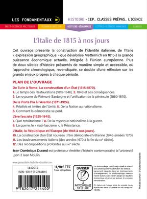 Cet ouvrage présente la construction de l’identité italienne, de l’Italie « expression géographique » que dévalorise Metternich en 1815 à la grande puissance économique actuelle, intégrée à l’Union européenne. Plus de deux siècles d’histoire présentés de manière simple et accessible, où l’approche chronologique, revendiquée, se double d’une réflexion sur les grands enjeux propres à chaque période.
