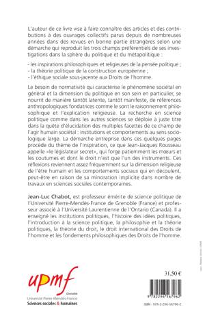 Ce livre met en lumière des articles et des contributions portant sur les inspirations philosophiques et religieuses de la pensée politique, la théorie politique de la construction européenne et l'éthique sociale sous-jacente aux Droits de l'homme. Le besoin de normativité, qui caractérise le phénomène sociétal en général et la dimension du politique en son sein en particulier, se nourrit de références anthropologiques fondatrices comme le sont le raisonnement philosophique et l'explication religieuse.
