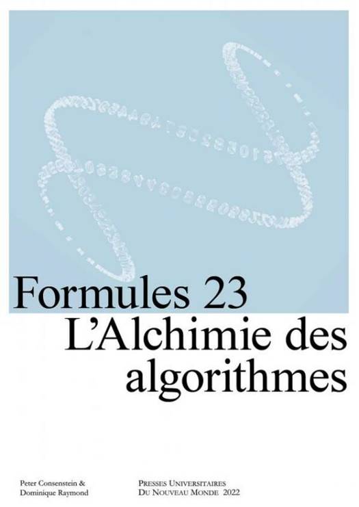La Revue FORMULES 23, L'ALCHIMIE DES ALGORITHMES, s'interroge plus spécialement sur le rapport entre les formes et les contraintes liées à l'univers numérique lorsqu'il se transporte dans le domaine des sciences humaines et des productions plastiques. L'alchimie qui dépasse toute frontière, matérielle ou temporelle, ou nouvelle alchimie, complètement autre? L'alchimie des algorithmes crée-t-elle un sens nouveau? Quelles bulles (sociales, politiques, ethniques, discursives, plastiques) fait-elle éclater? Voilà donc la matière à réflexion et débats qui traverse les contributions de ce dossier, dont les textes ont été réunis par Peter Consenstein et par Dominique Raymond.