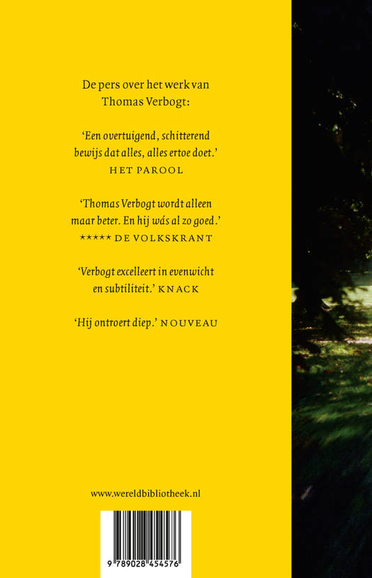 De pers over het werk van Thomas Verbogt: 'Een overtuigend, schitterend bewijs dat alles, alles ertoe doet.' Het Parool 'Thomas Verbogt wordt alleen maar beter. En hij wás al zo goed.' ***** de Volkskrant 'Verbogt excelleert in evenwicht en subtiliteit.' Knack 'Hij ontroert diep.' Nouveau