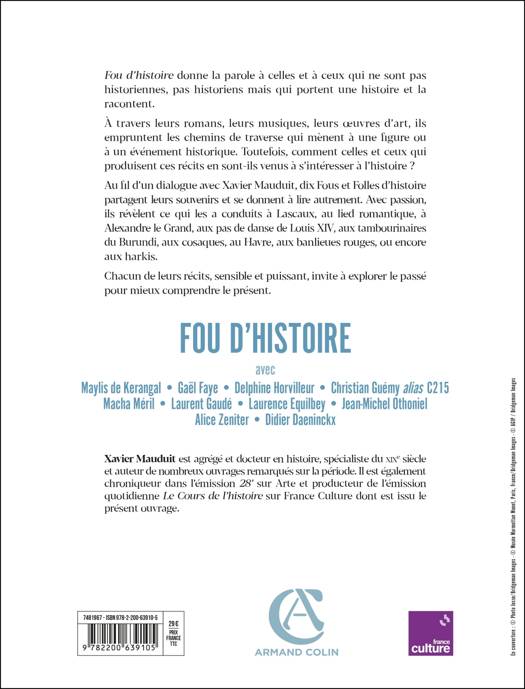 Au fil d'un dialogue avec Xavier Mauduit, dix Fous et Folles d'histoire partagent leurs souvenirs et se donnent à lire autrement. Avec passion, ils révèlent ce qui les a conduits à Lascaux, au lied romantique, à Alexandre le Grand, aux pas de danse de Louis XIV, aux tambourinaires du Burundi, aux cosaques, au Havre, aux banlieues rouges, ou encore aux harkis.