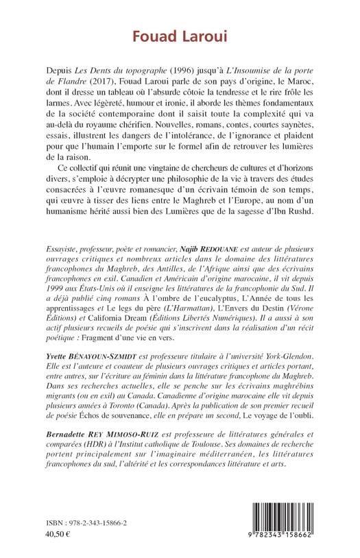 Depuis Les Dents du topographe (1996) jusqu'à L'Insoumise de la porte de Flandre (2017), Fouad Laroui parle de son pays d'origine, le Maroc, il en dresse un tableau où l'absurde côtoie la tendresse et le rire frôle les larmes. Avec légèreté, humour et ironie, il aborde les thèmes fondamentaux de la société contemporaine dont il saisit toute la complexité qui va au-delà du royaume chérifien.
